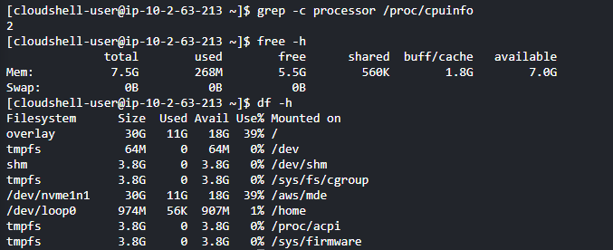 대충 실행 환경은 AWS Linux2 AMI, 2 vCPU, 8GiB MEM, 30GiB /root, 1GiB /home 정도 되는 것 같다. 지금 사용하고 있는 테스트 서버가 t4g.small에 10GiB /root인데…… 리소스 자체는 좀 더 넉넉한 것 같다. 참고로 CloudShell 자체는 무료다!