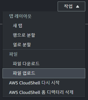 이 글에서 접속할 EC2는 pem 키가 필요하다. CloudShell에서 제공하는 파일 업로드 기능을 사용해 서버에 pem 키를 업로드한다.