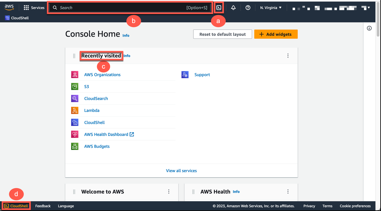 AWS 콘솔에 로그인한 사용자는 다음과 같은 경로로 CloudShell을 사용할 수 있다.