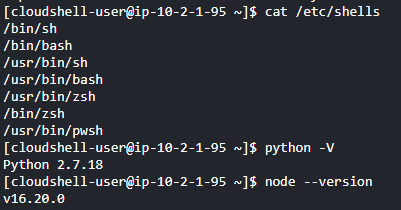 브라우저 기반의 사전 인증된 Shell로, AWS Management Console에서 사용할 수 있다. CloudShell을 시작하면 Amazon Linux 2 기반의 컴퓨팅 환경이 생성되고 Bash, PowerShell, Z shell 등의 원하는 쉘을 이용해 AWS CLI를 사용할 수 있다. 즉, 별도의 설치 없이 AWS CLI를 수행할 수 있다.