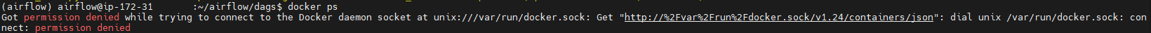 airflow를 통해 도커 컨테이너를 실행시키기 위해서는 airflow를 실행하는 사용자에게 도커를 실행시킬 수 있는 권한이 부여되어 있어야 한다. 만약 부여되어 있지 않다면 permission denied 에러가 발생한다.