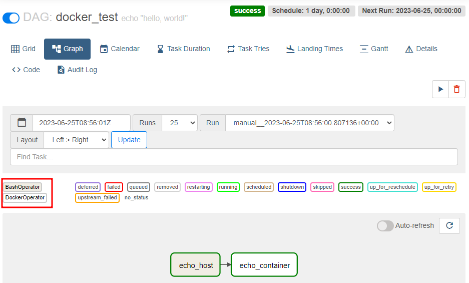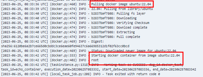 BashOperator는 Airflow를 실행하는 사용자의 이름이, DockerOperator는 컨테이너 내 사용자의 이름이 출력된 모습을 확인할 수 있다.