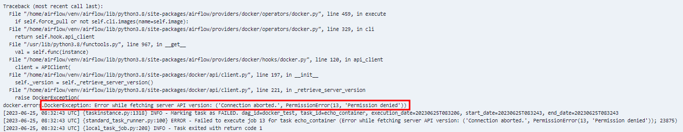 airflow를 통해 도커 컨테이너를 실행시키기 위해서는 airflow를 실행하는 사용자에게 도커를 실행시킬 수 있는 권한이 부여되어 있어야 한다. 만약 부여되어 있지 않다면 permission denied 에러가 발생한다.