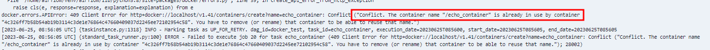 auto_remove를 항상 수행하도록 지정하던지, 아니면 task가 실행될 때마다 container 이름이 다르게 지정되도록 하는 것이 좋아 보인다.