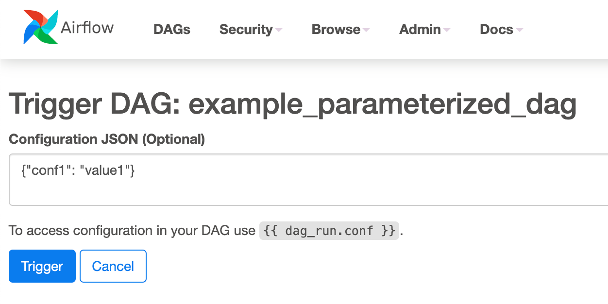 airflow dags trigger [-h] [-c CONF] [-e EXEC_DATE] [-r RUN_ID] [-S SUBDIR]