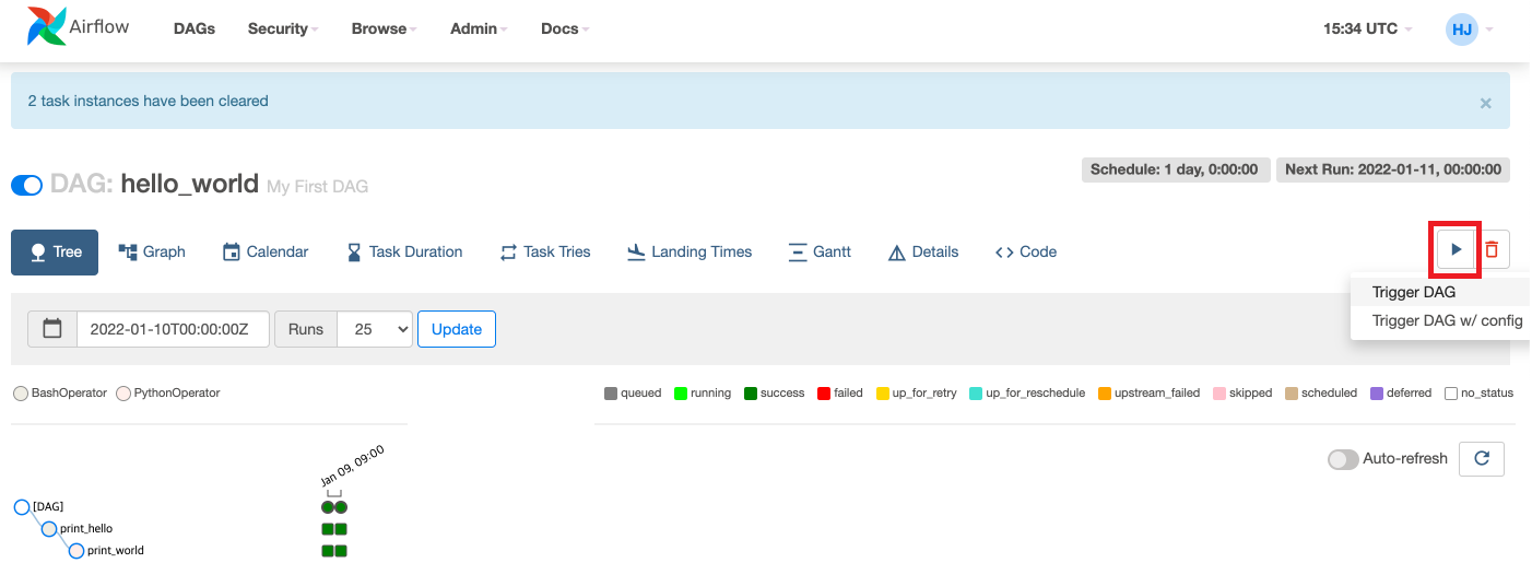 DAG의 오른쪽 상단의 실행 버튼을 클릭하여 트리거할 수 있다. Trigger DAG를 선택하면 매개변수 없이 실행한다.