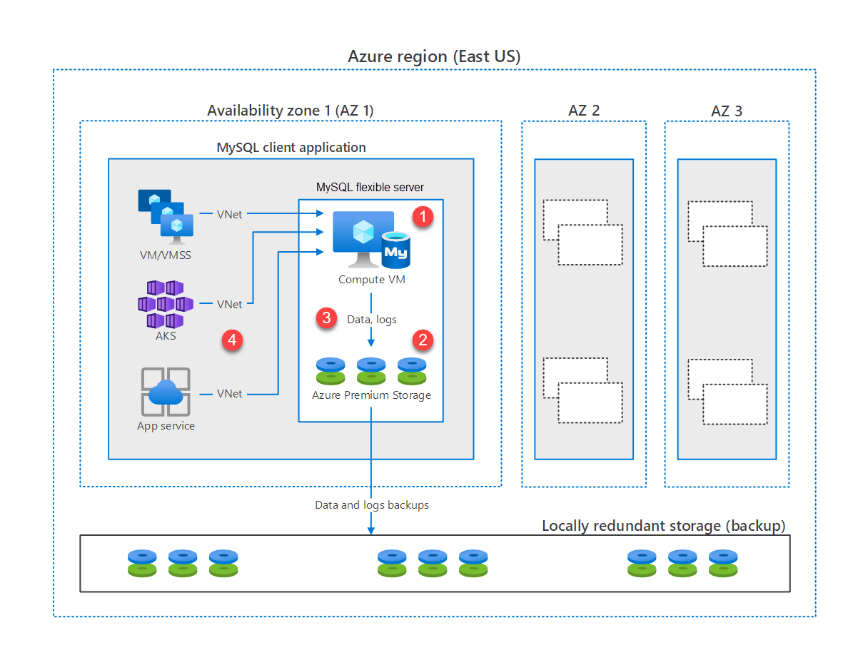 MySQL 인스턴스는 Azure VM에서 실행되며, 데이터와 로그는 Azure Preminu Storage에 저장된다.