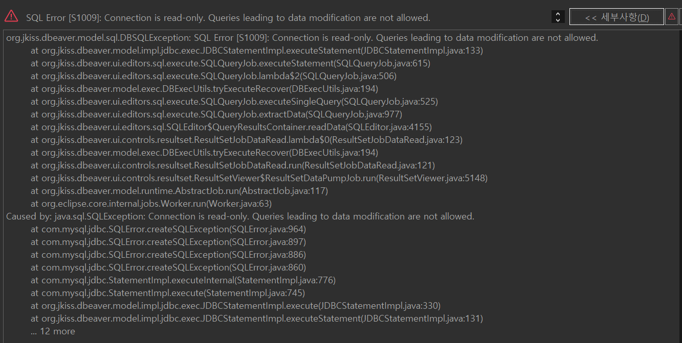 DBeaver를 사용해 MySQL에서 작업을 수행하려고 하는데, 언제부터인가 데이터 SELECT문은 정상적으로 동작하지만 ALTER, WITH, CREATE 등의 SQL을 사용할 때는 다음과 같은 에러가 발생하면서 수행되지 않았다.