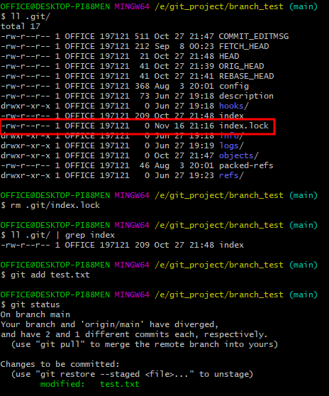 fatal: Unable to create 'E:/git_project/branch_test/.git/index.lock': File exists.