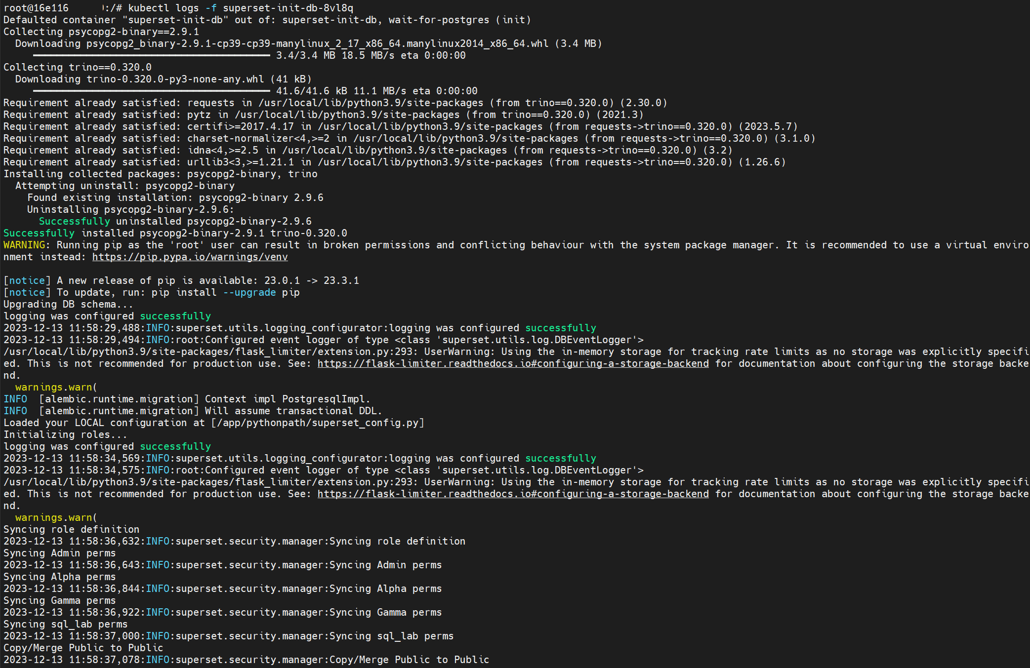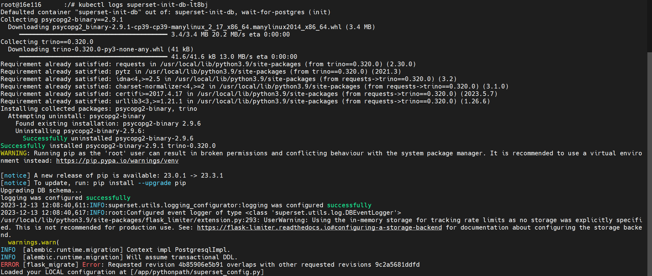 로그 내용을 보면 alembic이라는 단어를 확인할 수 있는데 alembic이란 SQLAlchemy 기반 데이터베이스 마이그레이션 도구이다. 데이터베이스 스키마를 관리하는데 revision이라는 개념을 사용하는데, 아무래도 superset db init 명령어 실행 중 revision 4b85906e5b91, 9c2a5681ddfd 간에 충돌(?)이 발생하는 것 같다.