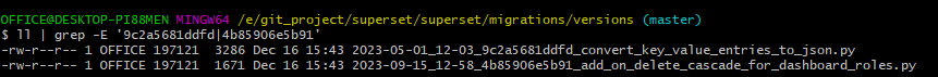 확인해 보면 버전이 두 개가 존재하는 것을 확인할 수 있다. 이 글의 superset은 2023-12-16 기준으로 최신 버전인 3.0.1을 사용하고 있으므로, 두 리비전 중 최신 리비전을 남겨둔다. 리비전은 https://github.com/apache/superset/tree/master/superset/migrations/versions에서 확인할 수 있다.