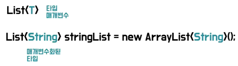 ArrayList 선언을 통해 확인할 수 있듯, generic은 컬렉션 내에서 사용할 내부 데이터 타입을 파라미터로 전달하듯 외부에서 지정한다. 조금 풀어서 말하면 타입을 변수화한 것이라고 생각할 수 있다.