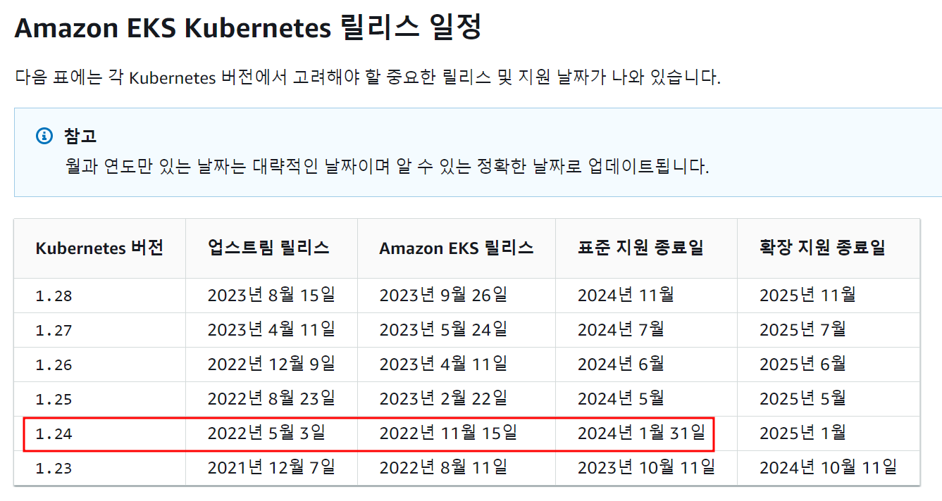 사용하고 있는 AWS EKS의 Kubernetes 1.24 버전이 2024년 1월에 EOS 될 예정이라 버전 업그레이드가 필요한 상황이다.