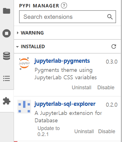 또는 JupyterLab의 pypi 관리자를 통해 설치할 수 있다.