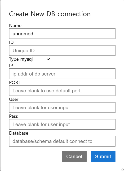 버튼을 클릭하면 연결할 데이터베이스 정보를 입력하는 폼이 나온다.