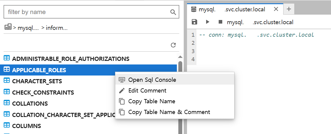 만약 SQL을 수행하고 싶다면, 마우스 우클릭 > Open Sql Console을 클릭하여 SQL 콘솔 창을 사용하면 된다.