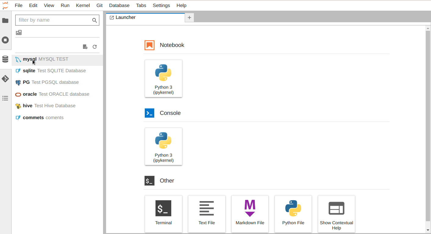 JupyterLab 내에서 테이블, 뷰와 같은 데이터베이스 객체를 탐색할 수 있고, SQL문을 직접 실행하고 반환된 결과를 확인할 수 있다. 또한 MySQL, PostgreSQL, Hive, SQLite, ORACLE 등 다양한 데이터베이스를 지원한다.