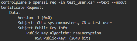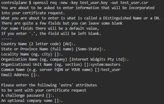 openssl req -new -key test_user.key -out test_user.csr -subj '/OU=system:masters/CN=test_user'