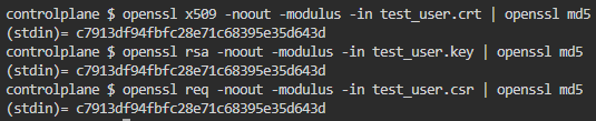 openssl x509 -noout -modulus -in <user.crt> | openssl md5