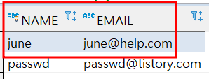 위와 같이 PK NAME과 EMAIL 컬럼으로 구성된 users 테이블이 존재하고, 데이터가 이미 저장되어 있다고 하자.