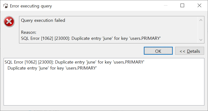 현재 상태에 다음과 같은 INSERT 문을 수행하면 Duplicate entry '' for key 'users.PRIMARY' 오류가 발생한다. PK인 NAME 컬럼에 이미 june이라는 값이 존재하기 때문이다.