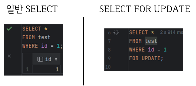 SELECT FOR UPDATE는 행 단위로 lock이 걸리므로, lock이 걸리지 않은 다른 데이터에 대해서는 SELECT FOR UPDATE를 수행할 수 있다고 한다. 하지만 이 글을 작성하면서 테스트했을 때는 락이 걸리지 않은 데이터에 대한 SELECT도 수행하지 않았다……🤔.