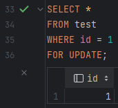 session 1에서 id가 1인 데이터에 FOR UPDATE를 수행하고, session 2에서 id가 1인 데이터에 SELECT / SELECT FOR UPDATE 모두 수행해 본다.