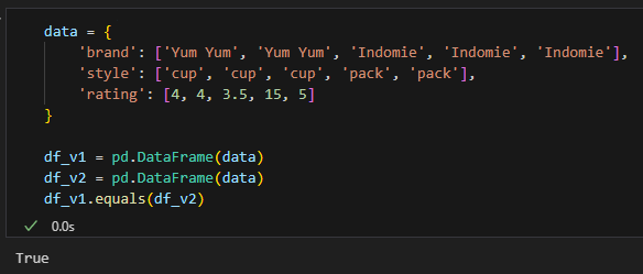 df_v1의 행 순서를 뒤집어서 df_v2를 생성했는데, 두 데이터프레임의 컬럼 순서가 동일해도 행 순서가 일치하지 않으면 역시 다른 데이터프레임이라고 취급하는 모습을 확인했다.