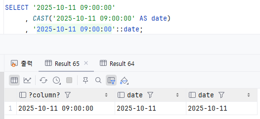 보면 CAST 결과와 :: 연산자의 결과가 동일한 모습을 확인할 수 있다.