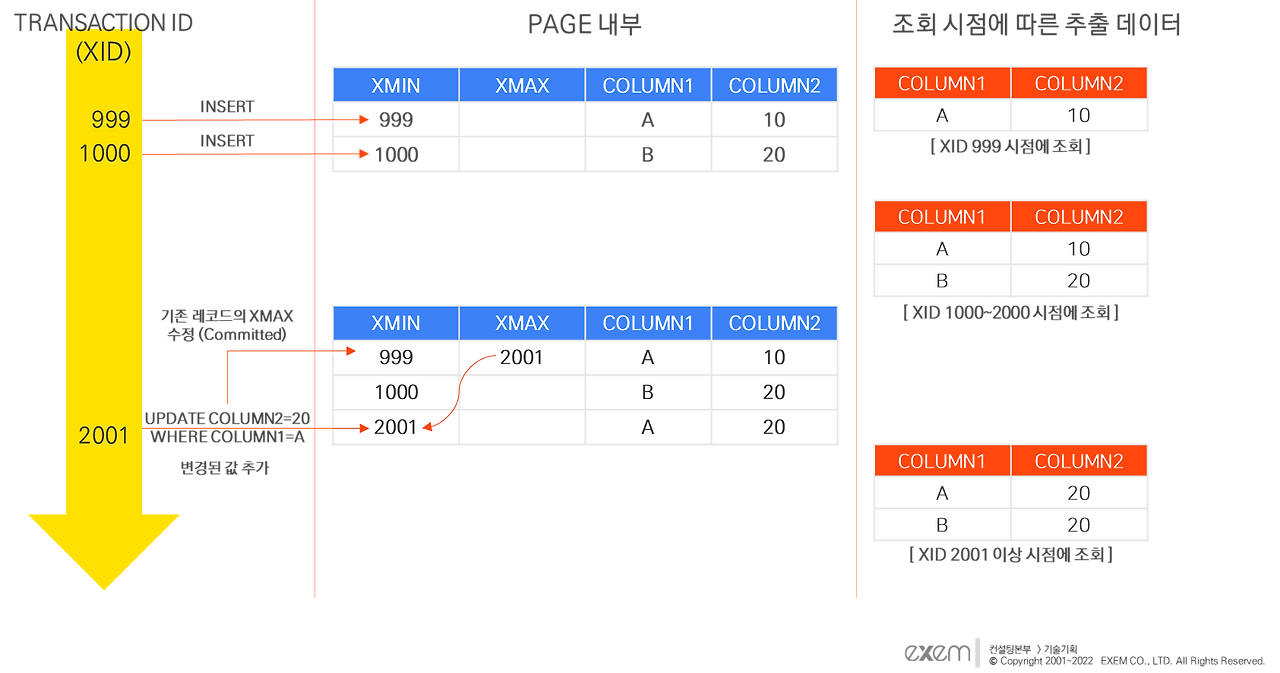 UPDATE : 해당 시점의 XID를 변경 전 레코드 XMAX에 기록 -> 해당 시점의 XID를 변경 후 레코드의 XMIN에 기록