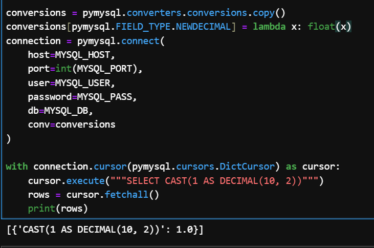 Python에서 PyMySQL을 사용해 데이터를 조회하다 보면 다음과 같이 Decimal이라는 객체로 값을 반환받는 경우가 있다.
