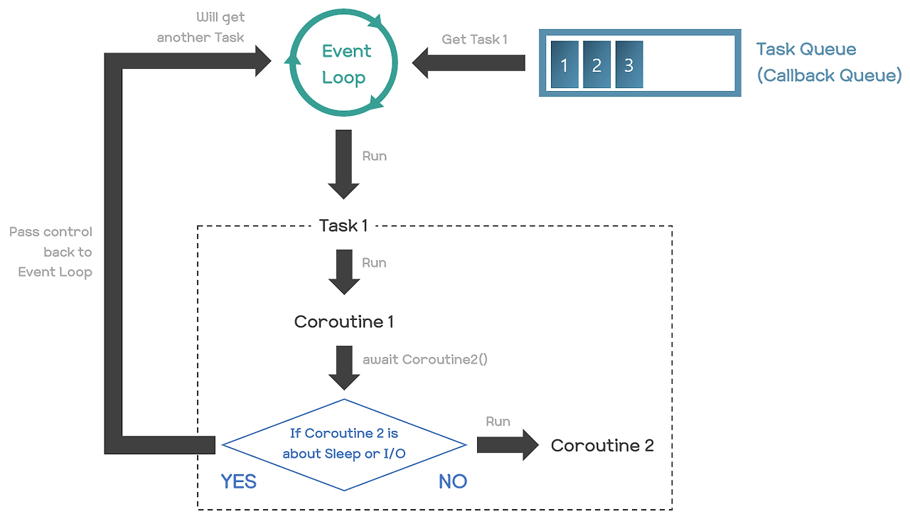 이벤트 루프란 무한 루프를 돌면서 매 루프마다 작업을 하나씩 실행시키는 로직을 의미한다. 달리 말해, 여기서 말하는 현재 스레드에 이벤트 루프를 설정한다는 것은 이벤트 루프를 실행시킬 수 있는 객체를 생성한 것에 해당하며, 작업(Task)이란 하나의 코루틴에서 출발하는 실행 흐름이라고 할 수 있다.