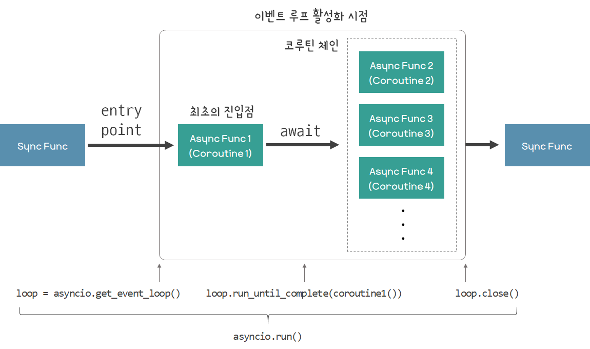 Python 비동기 프로그래밍에서 코루틴을 실행시키는 방법은 크게 await, asyncio.run, asyncio.create_task로 구분할 수 있다. await 키워드는 코루틴 내에서만 사용할 수 있는 방법이고, asyncio.run과 asyncio.create_task을 코루틴 밖에서 코루틴을 실행시킬 수 있는, 즉 코루틴 체인으로 들어가는 일종의 엔트리포인트에 해당한다. 특히 일반적인 asyncio.run은 일반적인 비동기 프로그래밍의 시작점에 해당한다.