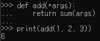 참고로 가변인자의 변수명으로는 args, kwargs를 많이 사용하는데 두 변수의 이름이 예약어는 아니다.