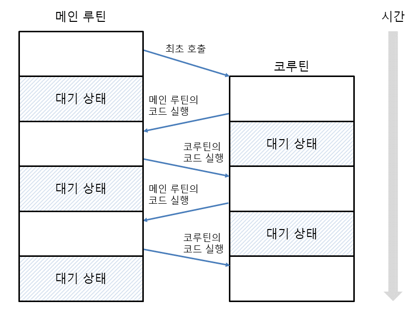 즉, 함수가 종료되지 않은 상태에서 메인 루틴의 코드를 실행한 뒤 다시 돌아와 코루틴의 코드를 실행한다. 코루틴이 종료되지 않았기 때문에 코루틴의 내용도 계속 유지될 수 있다.