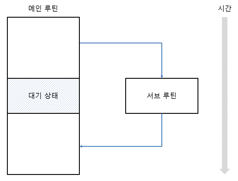 이 때 calc가 메인 루틴(main routine)이라면, add는 서브 루틴(sub routine)에 해당되는데, 메인 루틴과 서브 루틴의 관계, 동작은 아래 그림처럼 나타낼 수 있다.