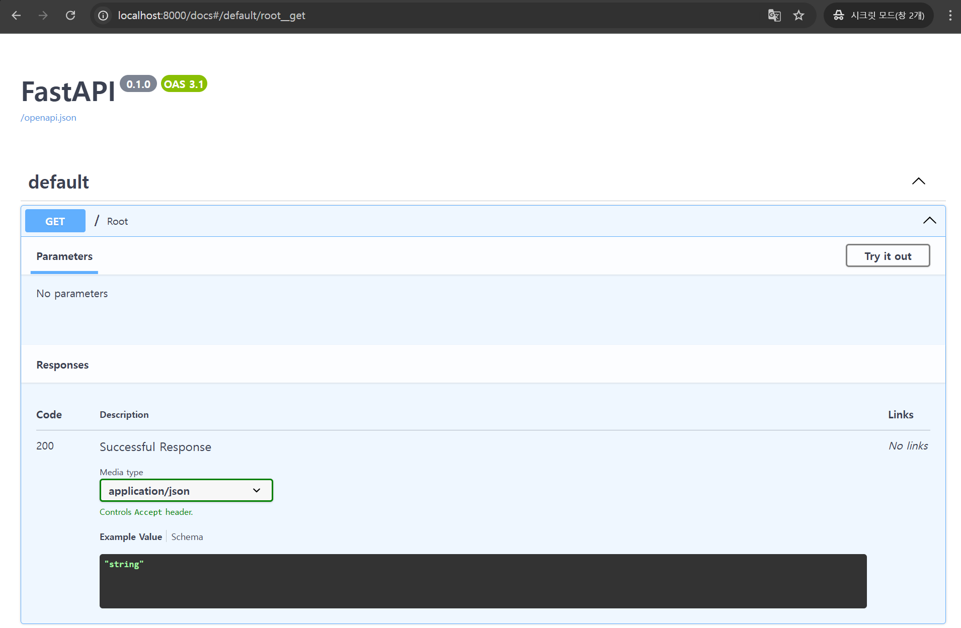 FastAPI를 실행하면 /docs 라는 경로로 Swagger 기번욿 자동 생성된 API 문서를 확인할 수 있다.