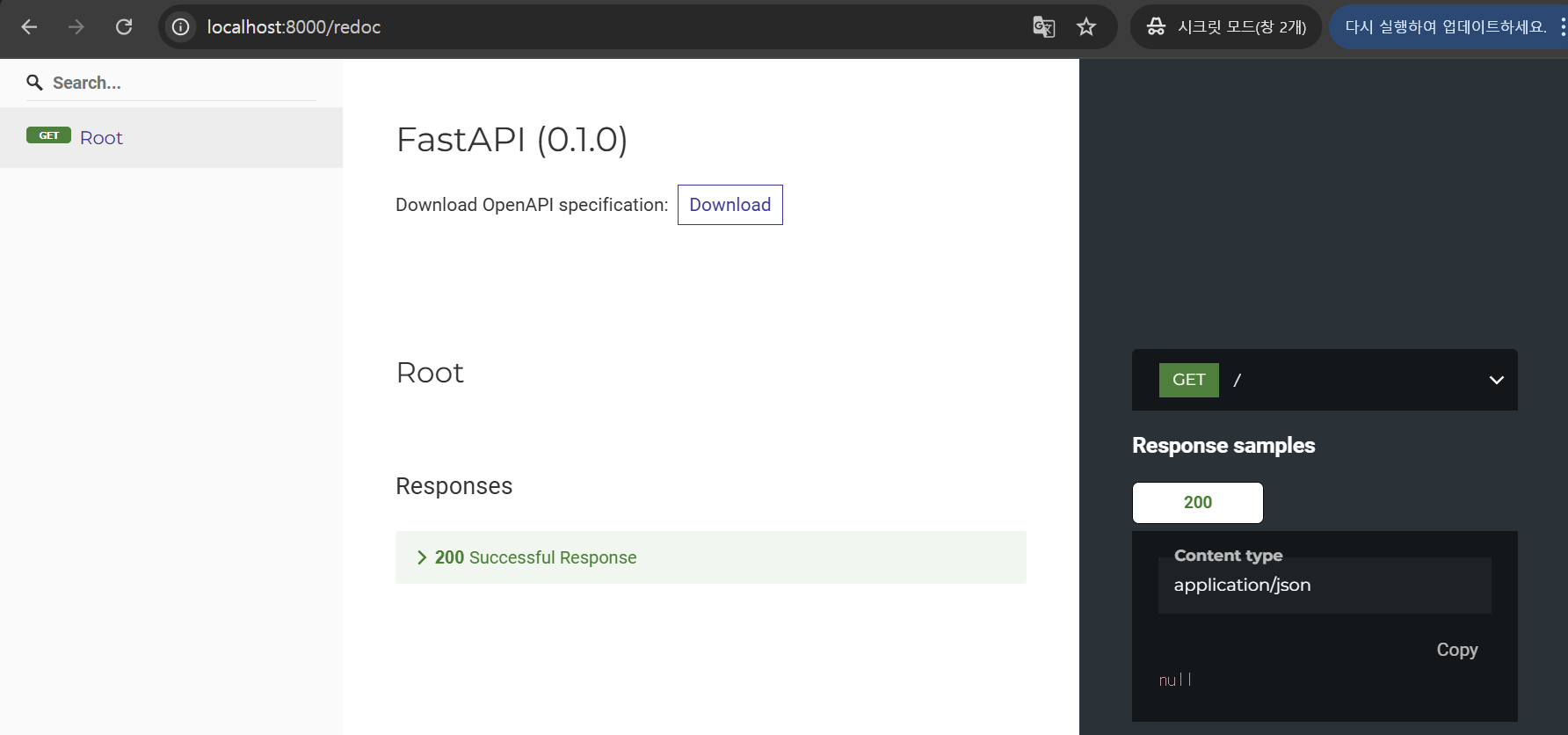 /redocs로 접근하면 Redoc 기반 API 문서도 확인할 수 있다.