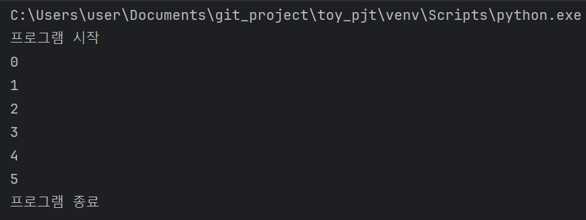 동작 후 종료하면 다음과 같이 프로그램 종료 시 KeyboardInterrupt 예외를 잡고 '프로그램 종료'라는 문자열을 출력하는 모습을 확인할 수 있다.