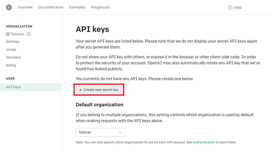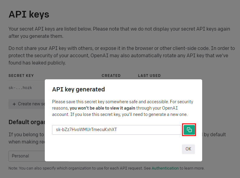 openai와 연동하기 위해 API를 설정해야 한다. 간단히 openai.api_key 값만 설정하면 된다.