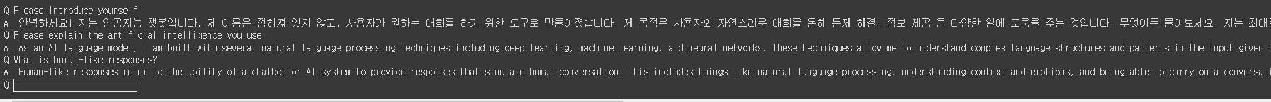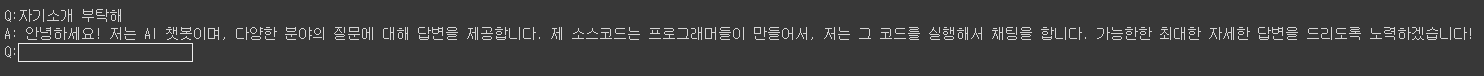 위 코드는 무한 루프이므로 사용자가 중지할 때까지 챗봇과 대화한다.