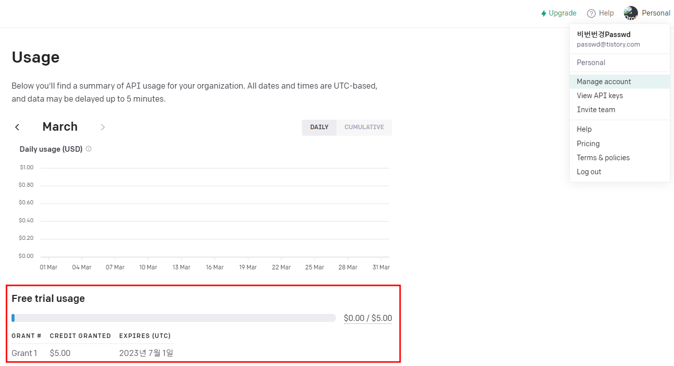 부여된 크레딧은 오른쪽 상단 Personal > Manage account로 이동하여 확인할 수 있다.