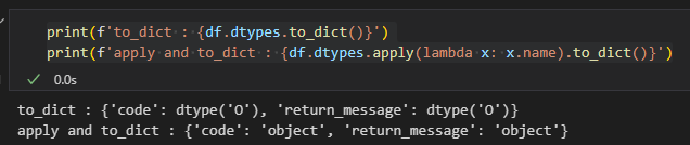 print(f'apply and to_dict : {df.dtypes.apply(lambda x: x.name).to_dict()}')