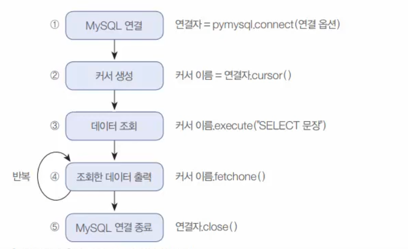 PyMySQL을 사용하여 MySQL을 다룰 때는 보통 연결 -> 커서 생성 -> SQL 실행 -> 연결 종료의 순으로 프로그래밍한다. 특히 SELECT 할 때는 아래 흐름도와 같은 순서로 프로그래밍한다.