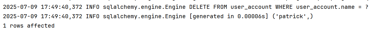 2025.07.02-[Python] SQLAlchemy - UPDATE 문 에서 SQLAlchemy를 사용해 테이블에 데이터를 UPDATE 하는 방법을 알아보았다. 이번 글에서는 테이블에 있는 데이터를 삭제하는 방법을 알아본다.