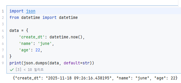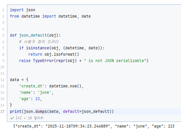 JSON은 문자열, 숫자, 배열, 객체와 같은 단순 유형만 직렬화할 수 있다. 다시 말해 datetime 객체는 JSON에서 지원하는 데이터 유형이 아니다. Python에서 제공하는 복합 객체이기 때문에 json.dumps가 바로 처리할 수 없다.