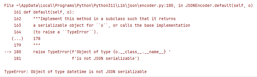 JSON은 문자열, 숫자, 배열, 객체와 같은 단순 유형만 직렬화할 수 있다. 다시 말해 datetime 객체는 JSON에서 지원하는 데이터 유형이 아니다. Python에서 제공하는 복합 객체이기 때문에 json.dumps가 바로 처리할 수 없다.
