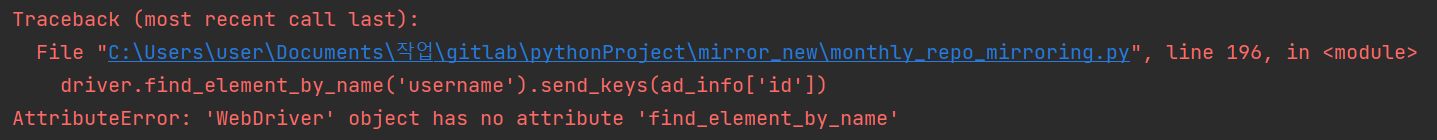 오랜만에 이전에 Selenium으로 만들어두었던 Python 코드를 살펴봤다. 실행을 시켜보고자 Selenium 패키지와 크롬 드라이버를 새로 설치하고 실행시켰더니 아래와 같은 에러가 발생했다.