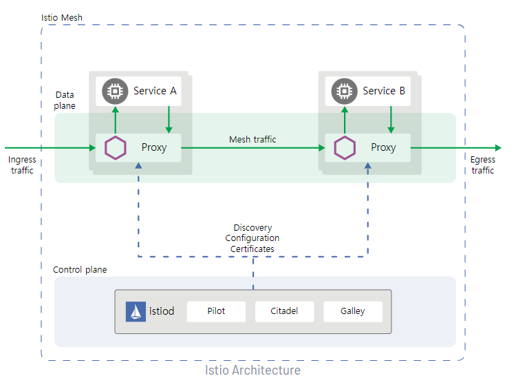 Service Mesh를 구현한 만큼 Istio는 DataPlane과 ControlPlane이 존재한다.