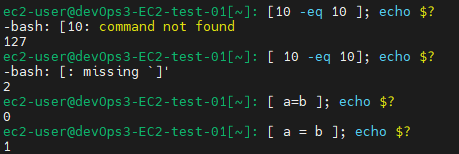 [의 경우 if문에서 사용되는 명령으로, 마지막에 인수로 ]를 필요로 한다. 아래에 오류가 발생하는 경우와 정상적으로 실행하는 경우를 정리해둔다.